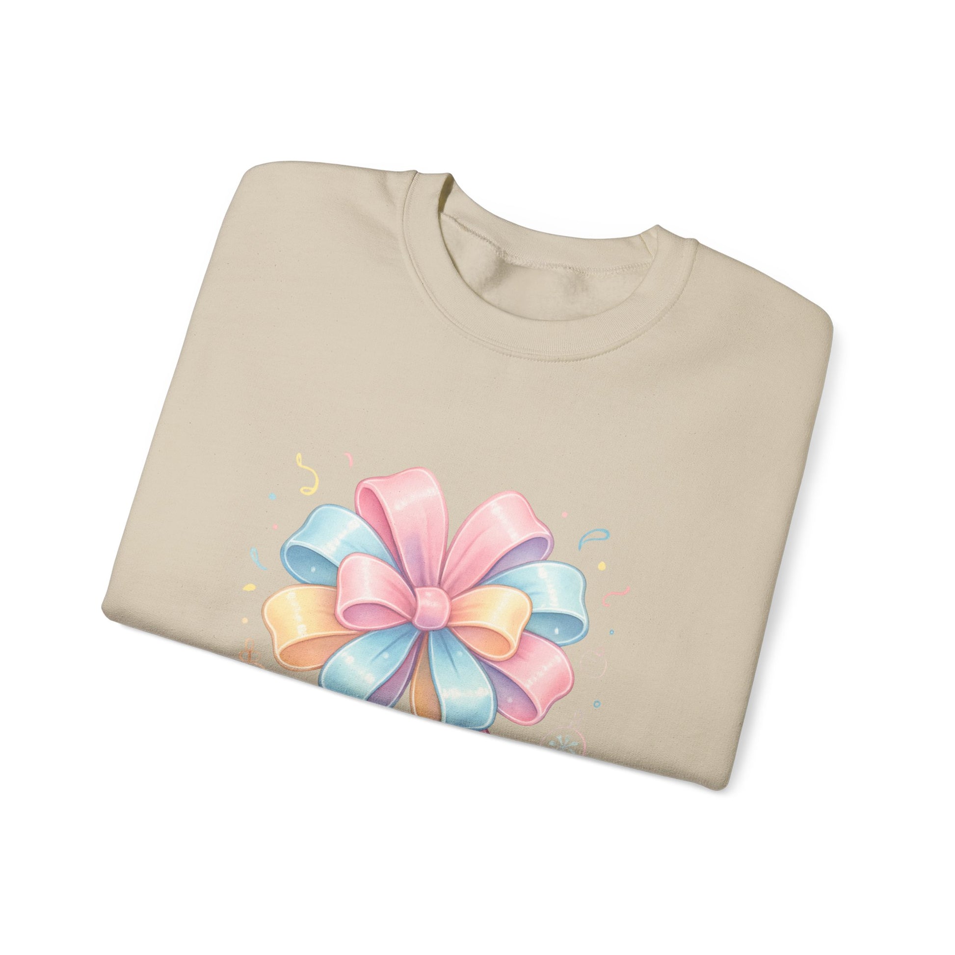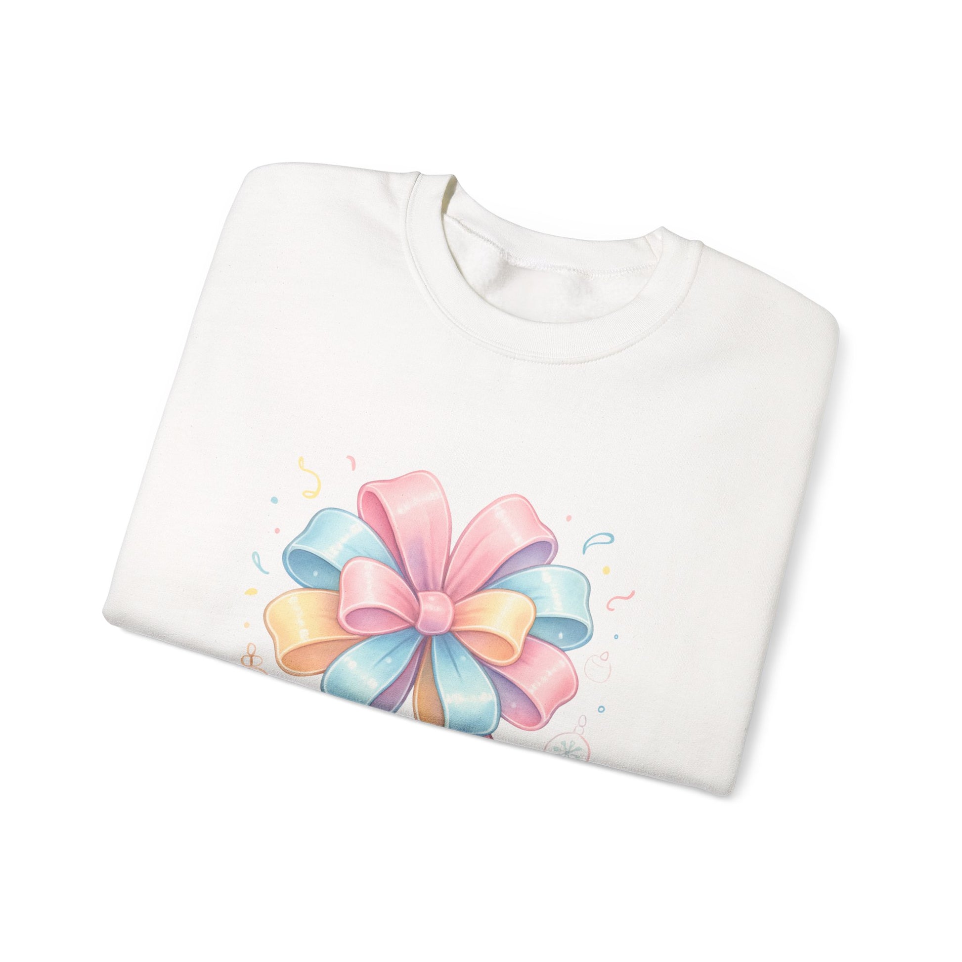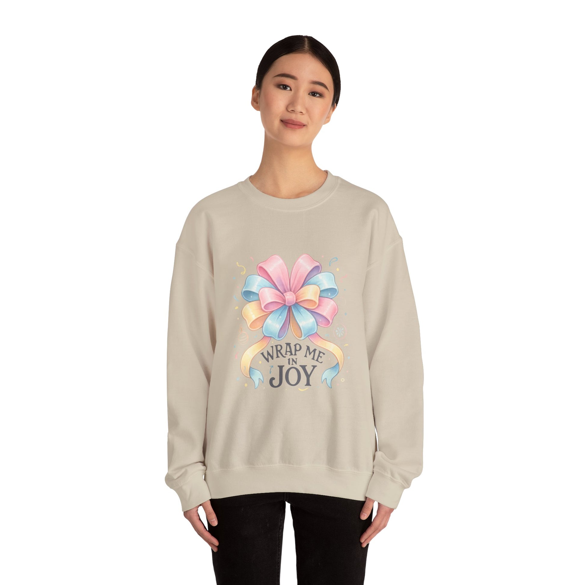 Crewneck Sweatshirt — "Wrap Me in Joy" Pastel Gift Bow Holiday Pullover