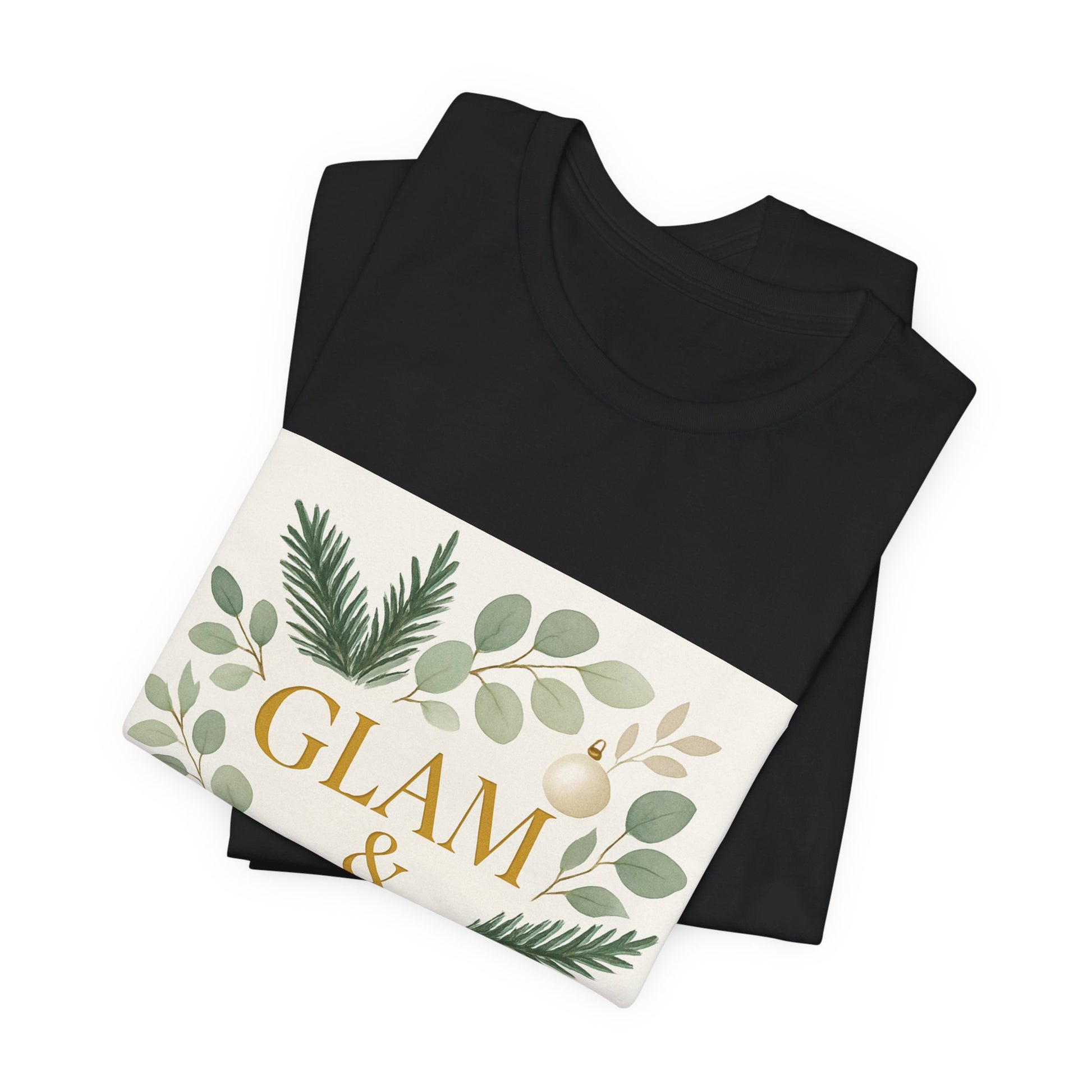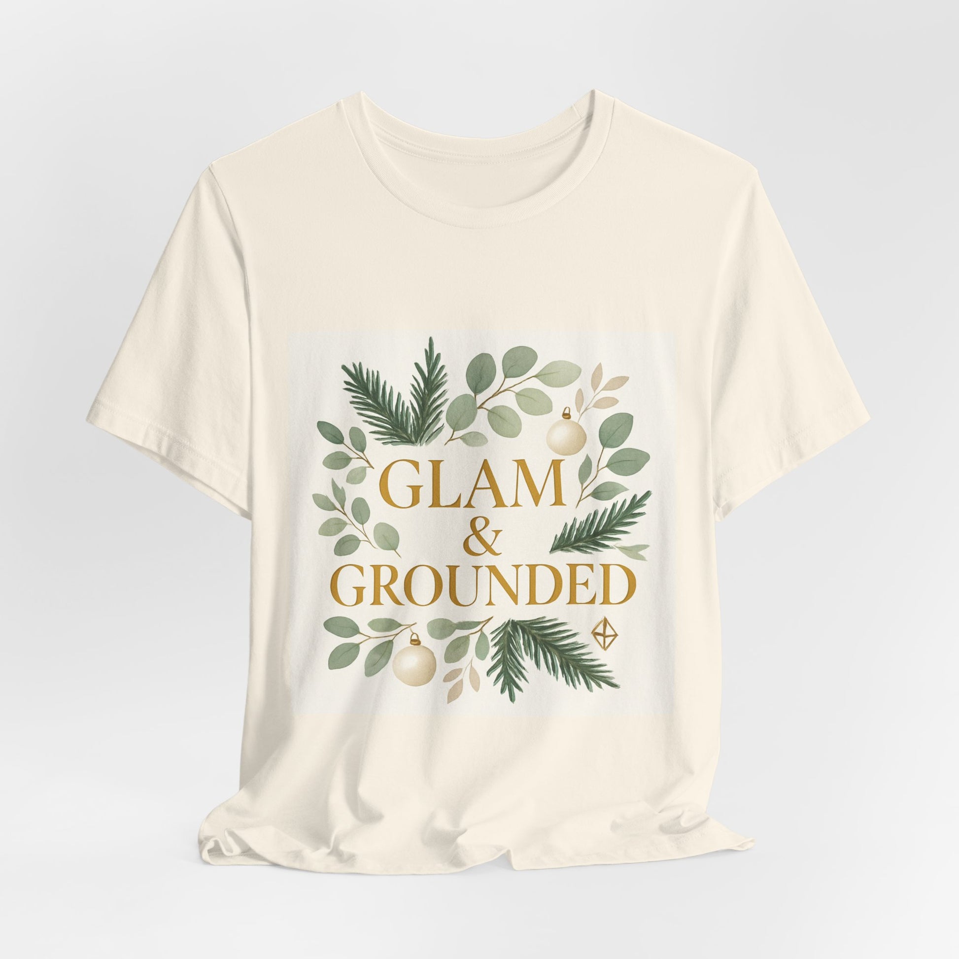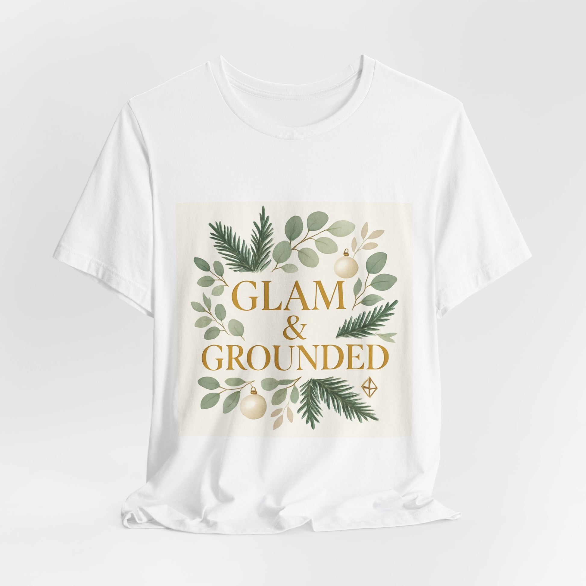 Lightweight, soft, and quietly festive — this tee balances polished style with down-to-earth comfort. A subtle botanical frame of evergreen sprigs and eucalyptus surrounds warm gold lettering that reads “GLAM & GROUNDED,” giving the shirt a calm holiday mood without shouting. Wear it layered under a cardigan for cozy winter mornings, or paired with jeans and boots for an easy, dressed-up-casual look. The crew neckline and retail fit keep the silhouette neat so accessories and scarves sit cleanly. Breathable cotton and thoughtful construction make this a go-to for chilly gatherings, slow afternoons by the fire, or any moment you want to look pulled together while staying comfortable.