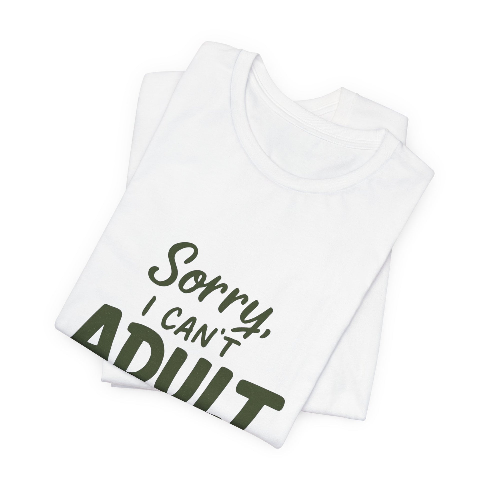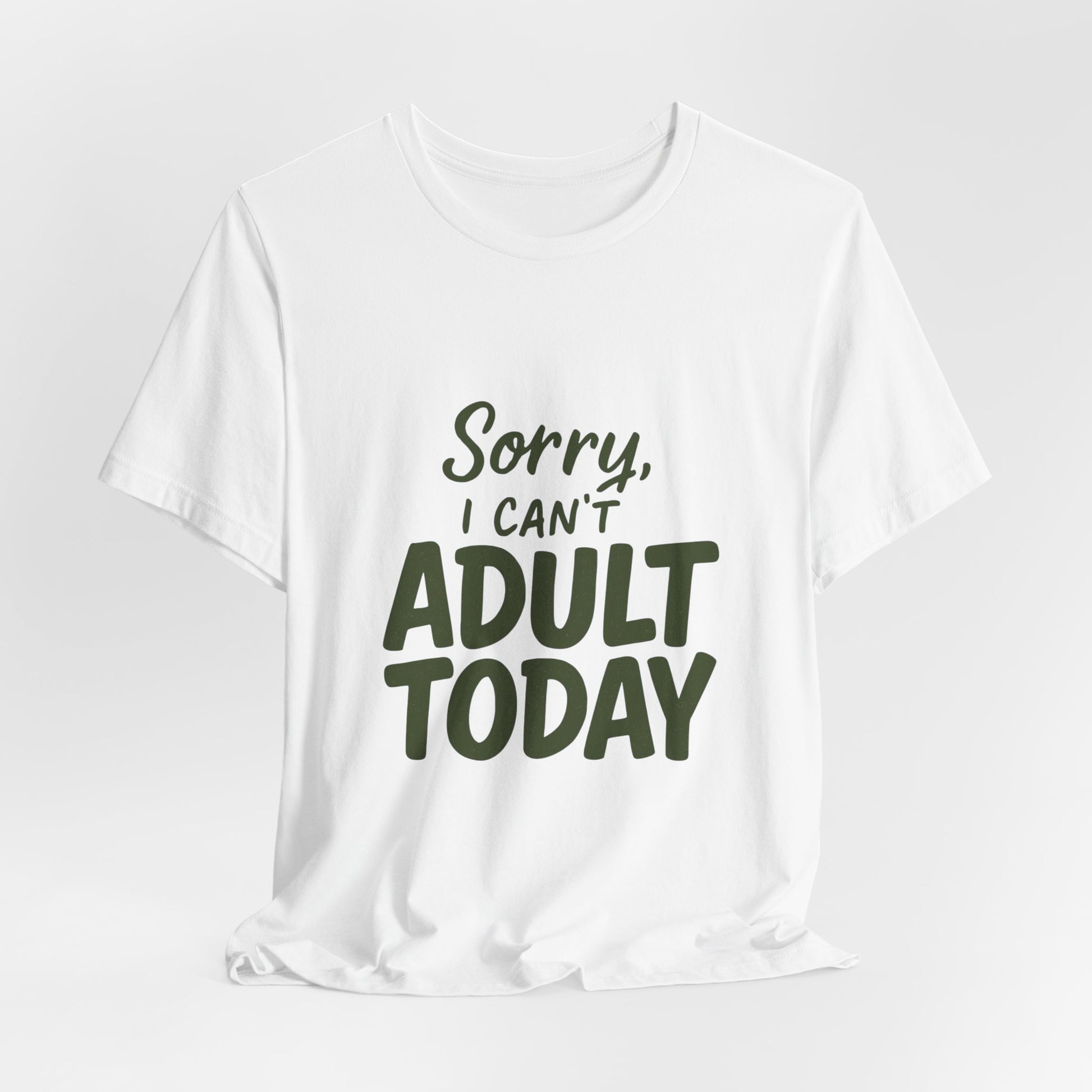 Soft, breathable cotton meets laid-back humor. This lightweight tee settles in like your favorite weekend ritual — relaxed shoulders, a casual crew neckline, and the cheeky message “Sorry, I can’t ADULT TODAY” printed on the front in a hand-lettered style. It reads like a note to the world: today’s for easy routines, low-key plans, and pressing pause on responsibilities. Wear it to slow mornings, errands that shouldn’t be rushed, or afternoons when you need permission to be playful. The simple white canvas and muted green lettering keep the look understated so the message does the talking.